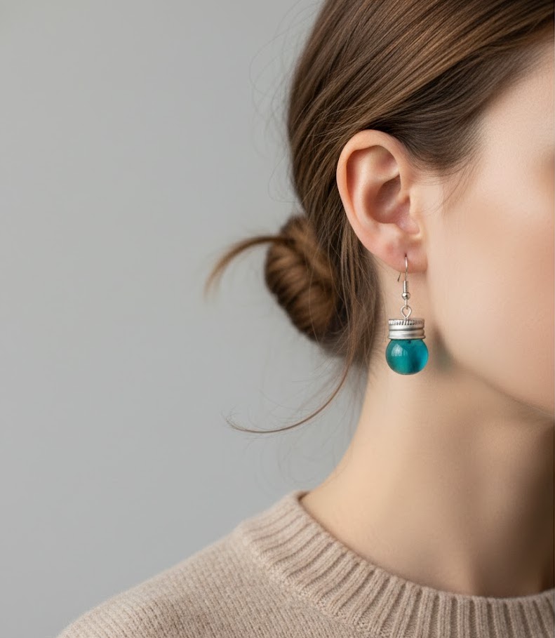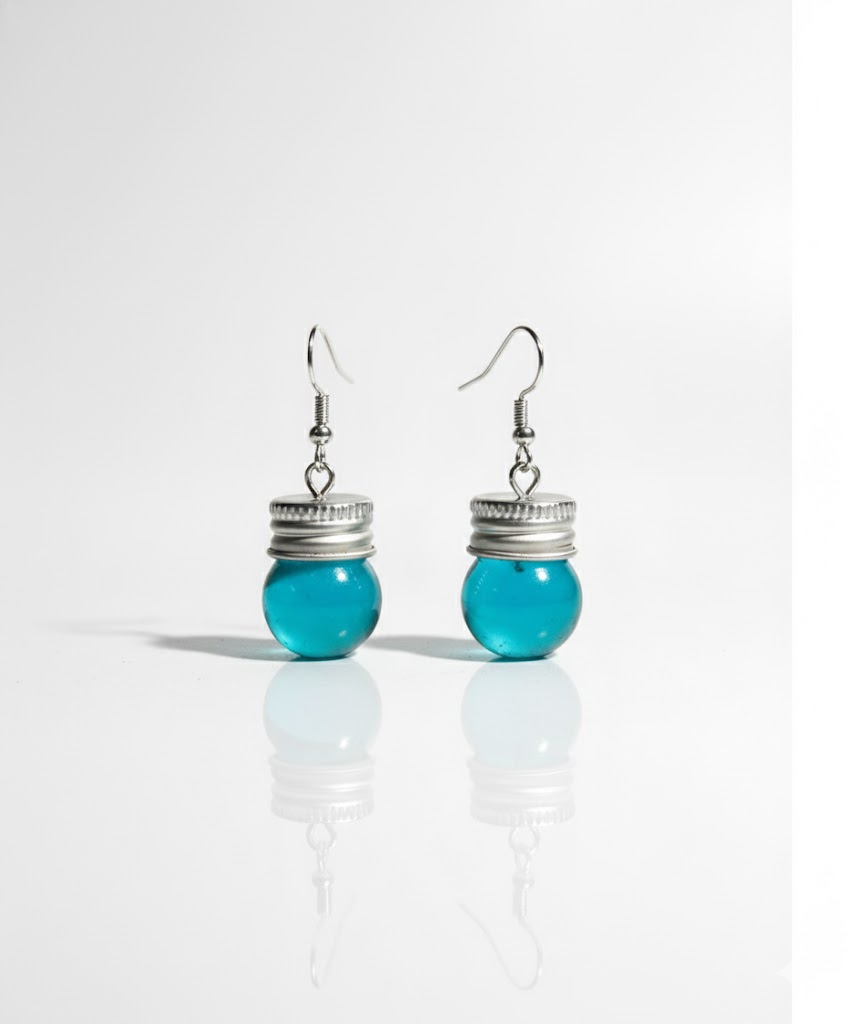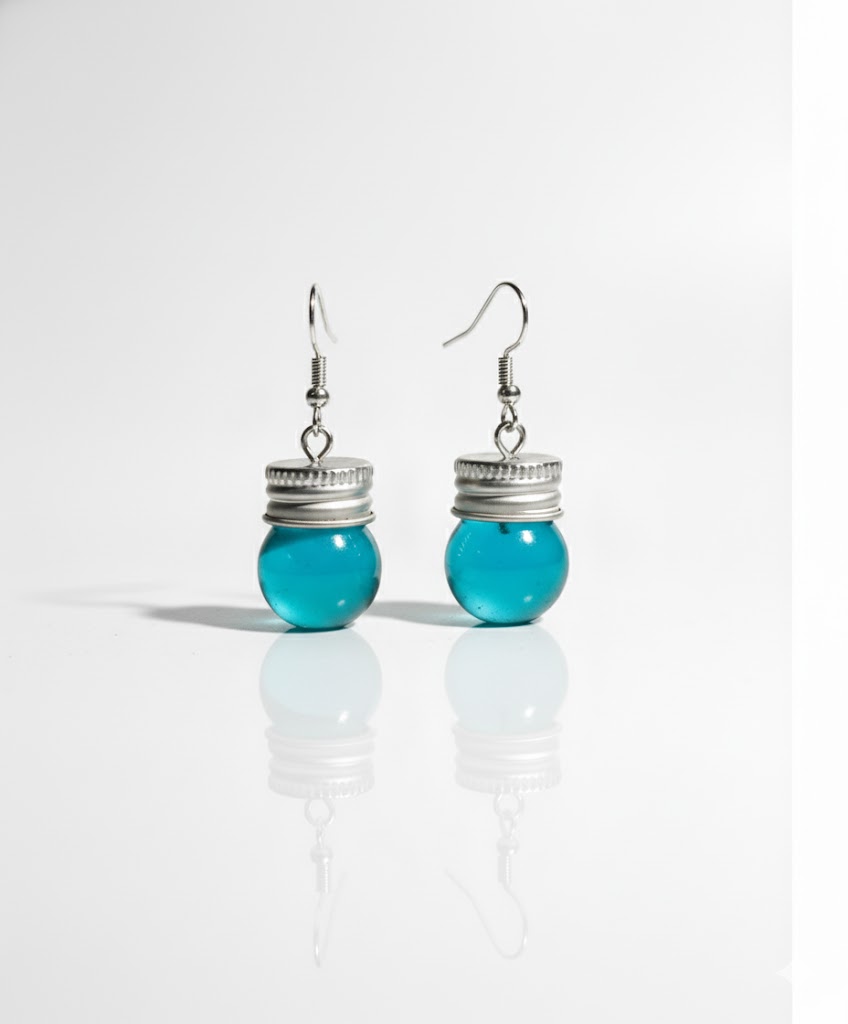 澄んだアクアブルーのガラスボールが目を惹く、アーティスティックなデザインのピアス。