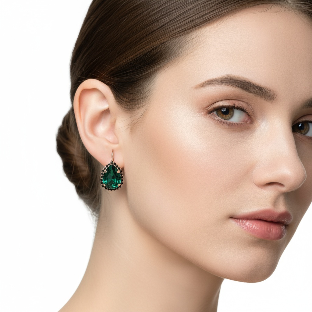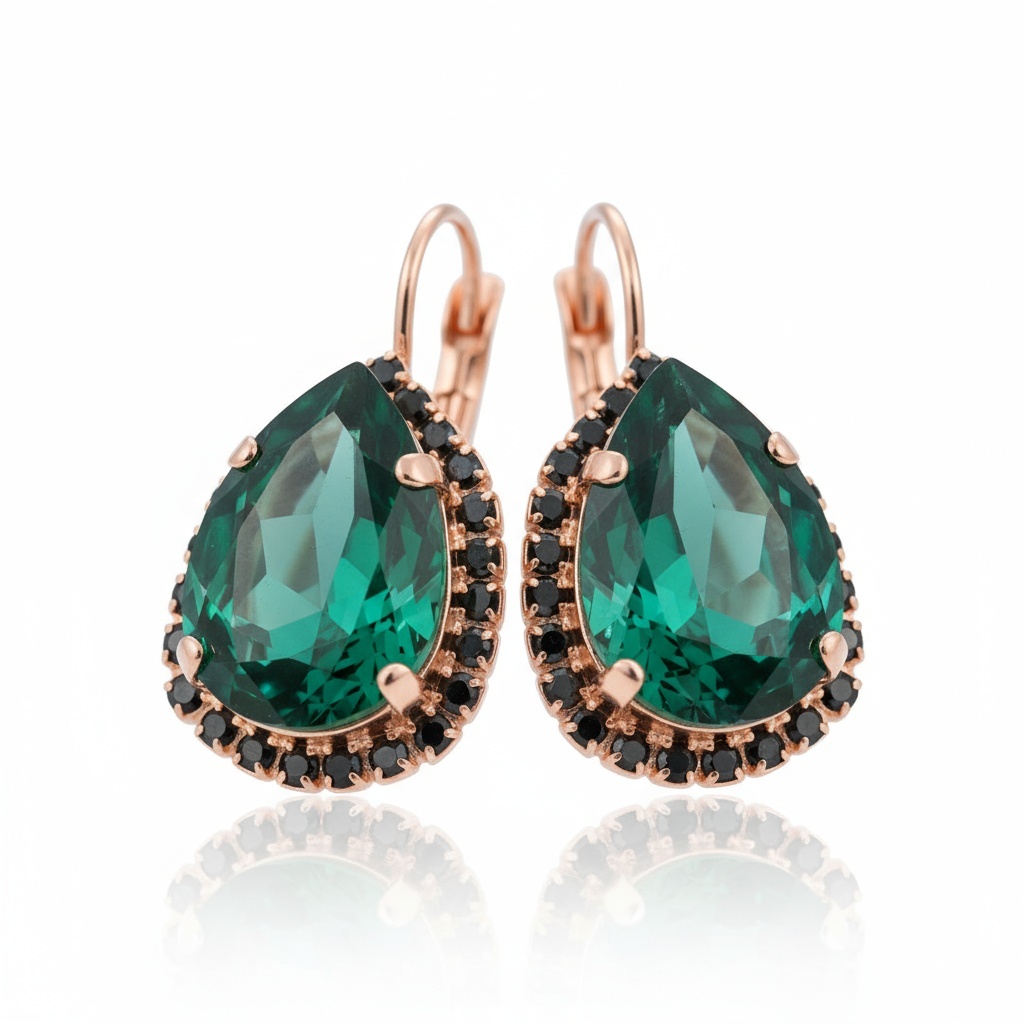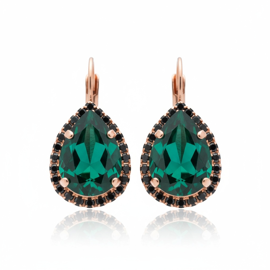 エメラルドグリーンの輝きとブラックダイヤのコントラストが美しい、雫型ピンクゴールドピアス。華やかで上品な印象を与える一品。