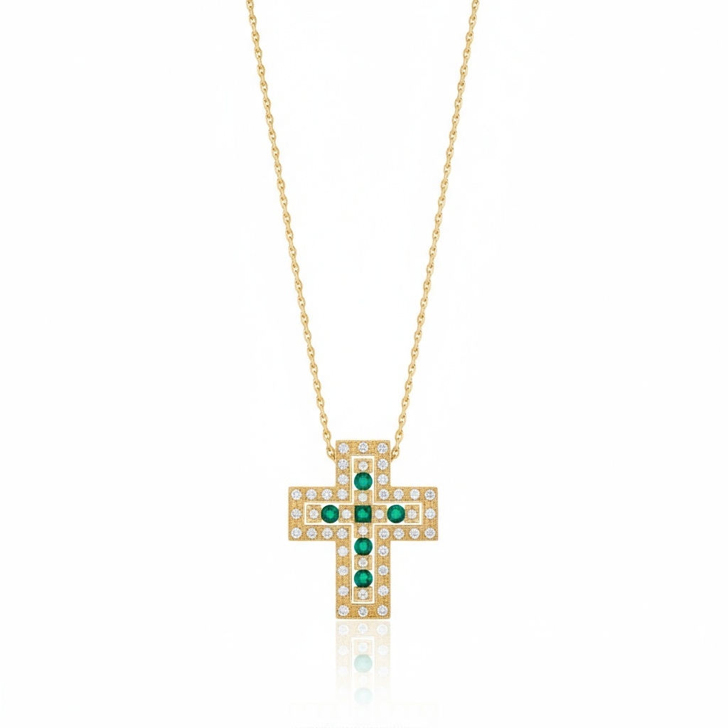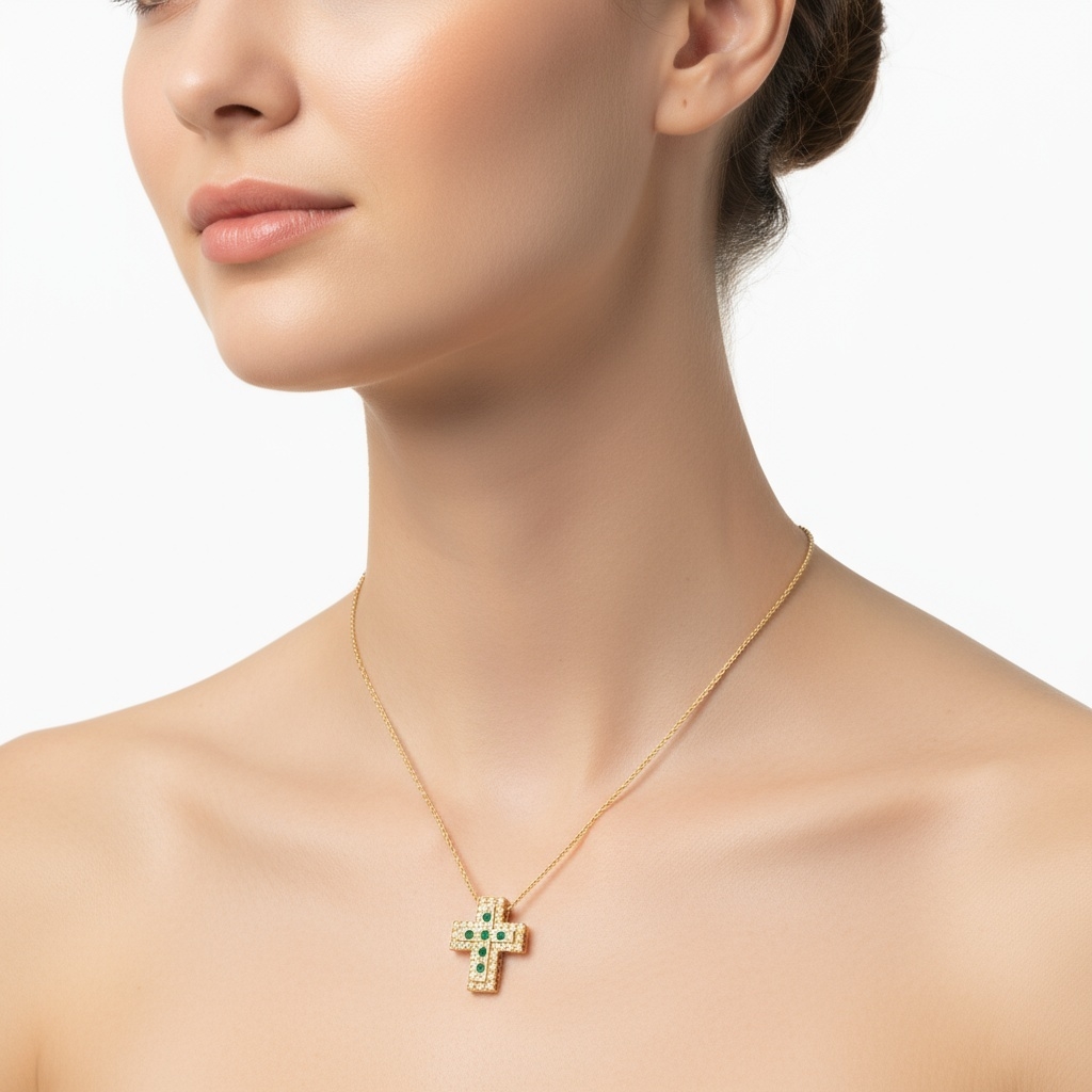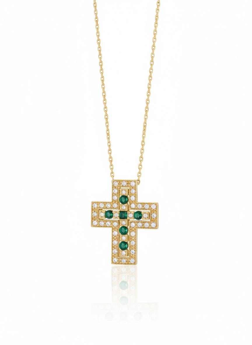 鮮やかなグリーンエメラルドと高品質ダイヤモンドを贅沢にセッティングした、クラシックかつモダンなクロスモチーフのネックレス。