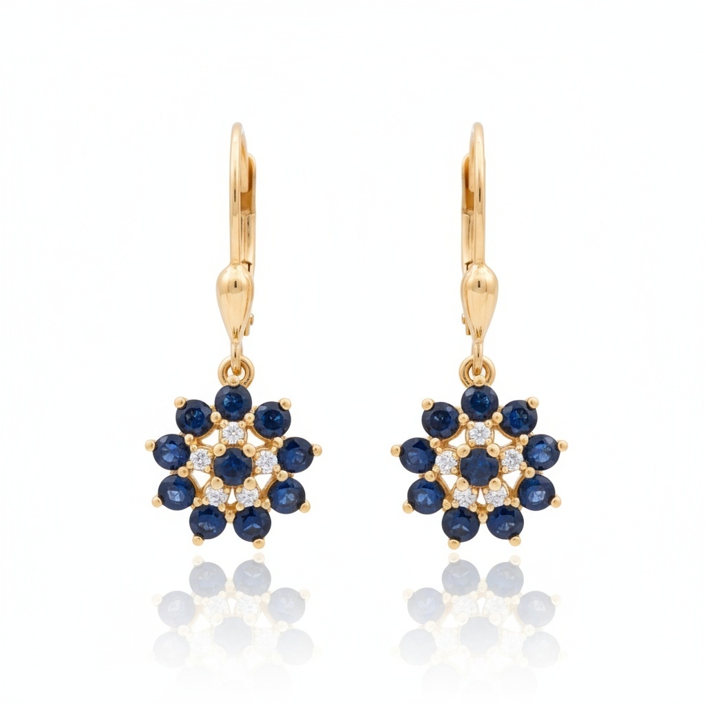 深く鮮やかなブルーの天然サファイアを贅沢にセッティングした、K18イエローゴールド製フラワードロップピアス。