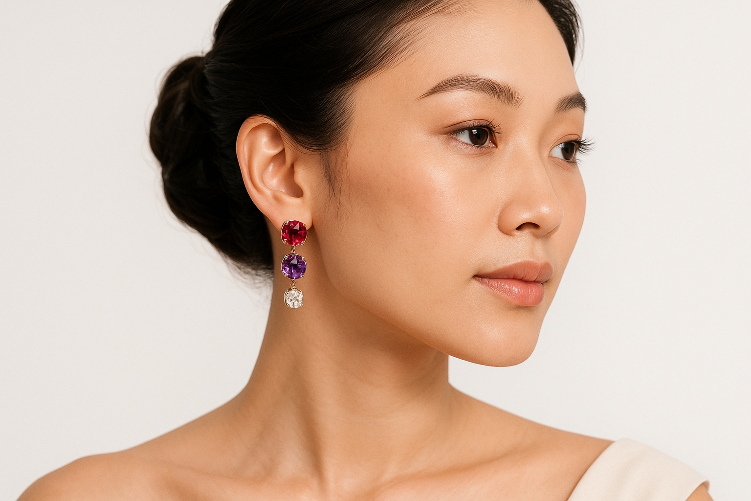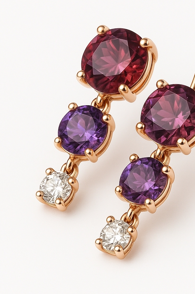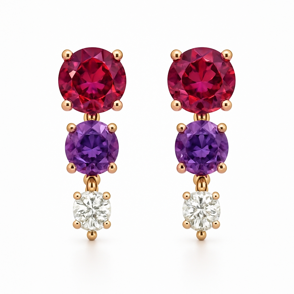ルビー、アメジスト、ダイヤモンドの3つの宝石を縦に並べた華やかなトリプルカラーデザインのピアス。上から順に燃えるような赤のルビー、高貴な紫のアメジスト、そして下部には透明感のあるダイヤモンドがきらめきます。それぞれの宝石が持つ個性を最大限に活かしながら、調和のとれた輝きを演出。地金にはK18ピンクゴールドを採用し、肌に柔らかく溶け込む上品な印象を与えます。フォーマルな装いからパーティーシーンまで、顔周りを華やかに彩るエレガントなジュエリー。職人による精緻な爪留めが、石の輝きを最大限に引き出します。