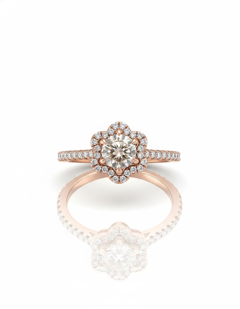 センターには高品質のラウンドブリリアントカットダイヤモンド(約0.5ct/F〜Gカラー/VSクラス)をセットし、その周囲をメレダイヤで囲む「フラワーハロー」デザインが、光を集めながら柔らかな輝きを放ちます。