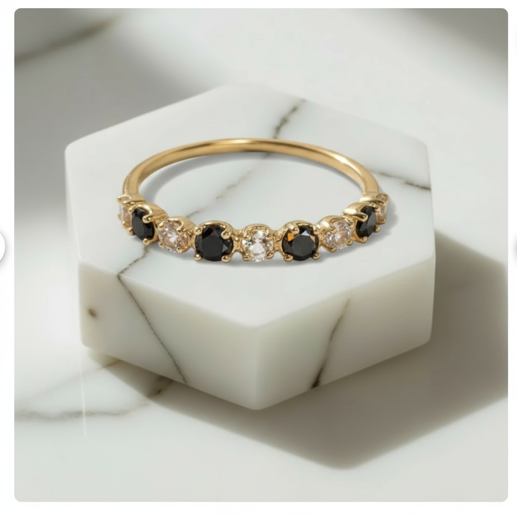 ブラックとホワイトのダイヤを交互に配したK18ゴールドリング。上品な輝きとモダンなコントラストが魅力のデザイン。